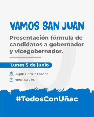 Ahora, inicia nuevamente el proceso y, también, la campaña de todos los candidatos a gobernadores de los distintos frentes y sublemas. En ese sentido, Vamos San Juan presentará al nuevo candidato, bajo el lema "Todos con Uñac".