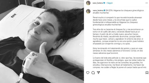 A principios de noviembre, en un posteo en su cuenta de Instagram, la actriz y cantante Vanesa Butera contó que le detectaron un tumor en el cuello del útero. De inmediato, comenzó con un tratamiento con quimioterapia.