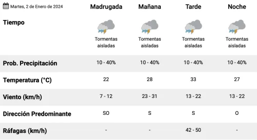 Para este martes 2 de enero, el SMN prevé tiempo inestable durante toda la jornada, con un 40% de probabilidades de ocurrencia de tormentas aisladas. Soplará viento desde el cuadrante sur, con ráfagas de hasta 50 km/h. La temperatura máxima será de 33 grados.